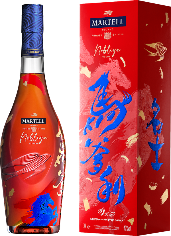 For the Martell VSOP, overlapping images of a galloping steed suggest the depth and intensity of its fruity aromas. Martell Noblige (see above) is adorned with a rearing horse, dramatically capturing the cognac’s vibrant, energetic personality. On Martell Cordon Bleu, the animal shifts direction at speed, echoing the elevated trajectory and singular status of the house’s most iconic expression. The same thoughtful approach extends to Martell XO and Martell XXO, with shimmering gold and silver tones lending the designs a more precious, refined quality.