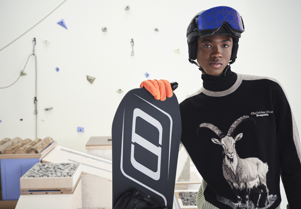 Sweater, turtleneck, ski goggles, ski helmet, Dior x Descente gloves, and snowboard,
