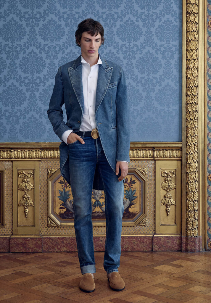 History remains Anderson’s primary material, but he treats it pragmatically. Medieval heraldry, 18th-century ornamentation and mid-century Dior codes are all present, yet none are handled so reverentially that they lack originality or contemporary application. A Bar jacket appears in Donegal tweed, an unmistakable nod to Monsieur Dior’s fondness for British tailoring, but it is styled with an ease that keeps it from feeling precious. Frock coats and tailcoats surface again, though they are just as likely to be cut from denim as from anything traditionally formal. Anderson is clearly interested in how status garments behave once their stiffness is removed.