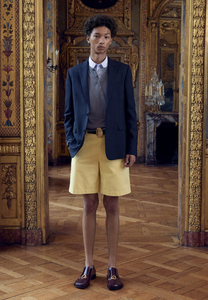 The wardrobe itself is expansive and intentionally non-hierarchical. Rugby shirts, blousons, striped button-downs, chinos and five-pocket trousers sit comfortably alongside more overtly historical pieces. The wide Delft shorts, now a familiar Anderson calling card, continue to blur distinctions between skirt and cargo, utility and theatre. They are worn with the matter-of-fact confidence of something already lived in, rather than something asking to be admired.