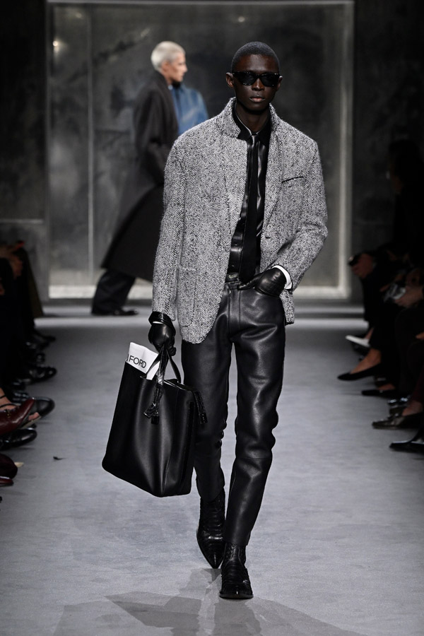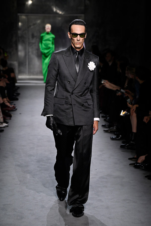 “Entering the house that Mr Ford built, I was drawn to the man himself, whose personality reverberates through everything he envisioned. He is nightlife, I am the morning after: this is where our dance begins,” Ackermann states in the collection notes. Envisioning the collection as living in private rooms of clubs—where tension lies between unattainability and desire. The look is sharp, with no-frills tailoring as the cornerstone in classic Tom Ford blacks, greys and whites; with punches of highlighter pastels. Leather becomes part of the narrative as devastating outerwear as well as luxurious tops, while a devil-may-care attitude is consistent throughout.