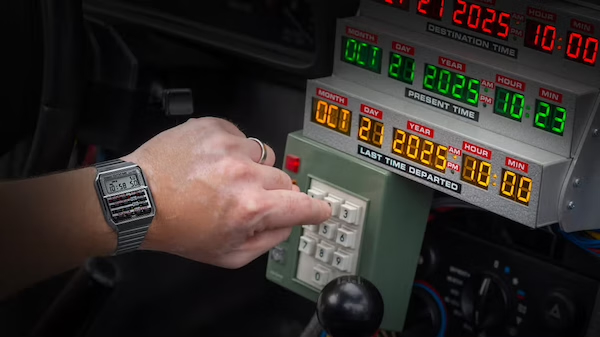 The new limited model, the CA-500WEBF, revives the original 1980s design made famous on Marty McFly’s wrist—this time reimagined with DeLorean details and ’80s packaging.