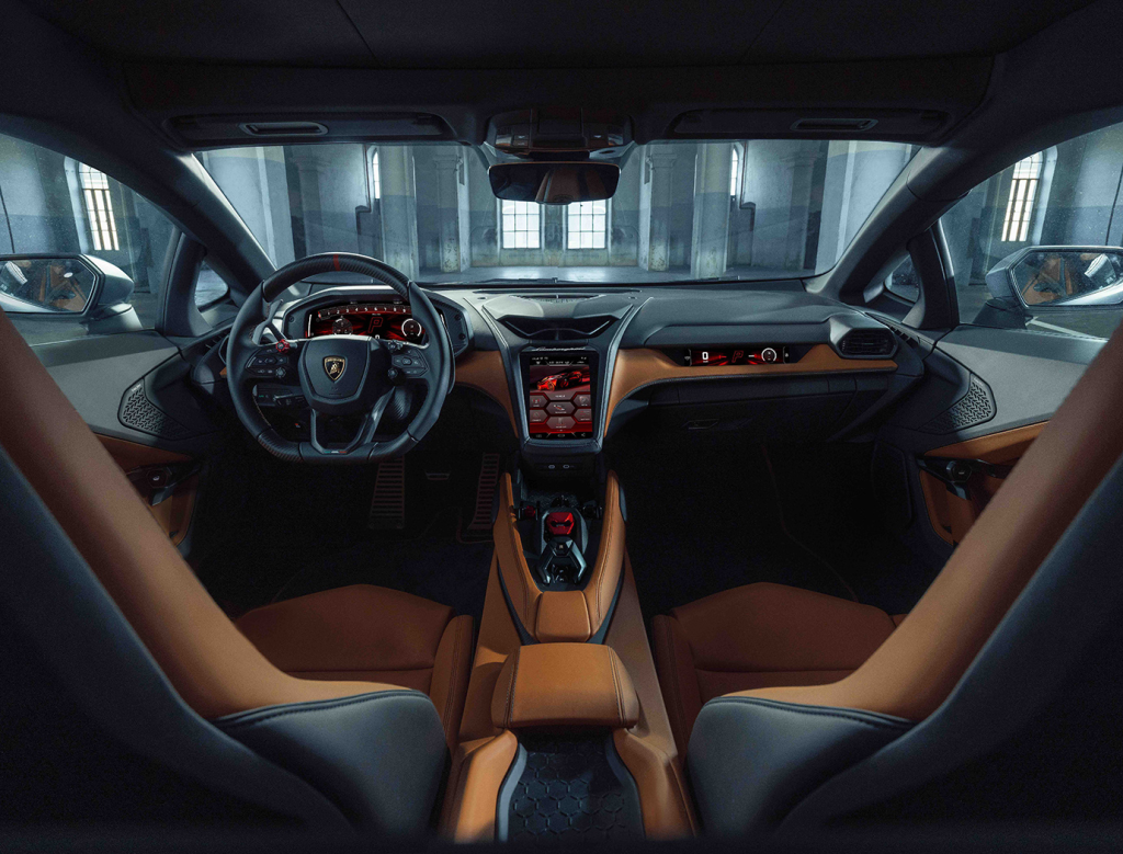 "Pilot Interaction" is Lamborghini’s name for user experience, and indeed, like the cars that came before, the Temerario very much has that fighter-jet cockpit feel. “You have screens, but we are not the king of television screens; we have the right amount of information, focused for the pilot.” This includes a small floating central screen that can ‘swipe’ information across to a secondary, thin passenger screen, set into the dashboard in front of the passenger. As an option, there’s also a fantastic, Temerario-bespoke, seven-speaker sound system from high-end, ultra-niche Italian brand Sonus Faber on the table—which has its own lore of mind-blowing engineering behind its creation as well.