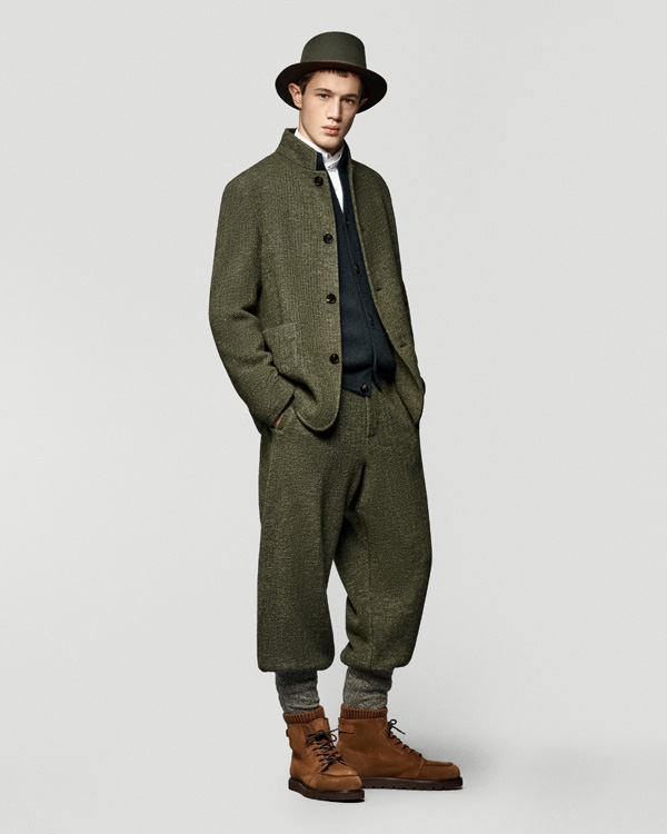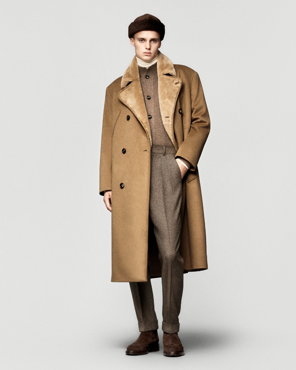 The evening proposals within the collection offer a new standard to sartorial dressing for formal occasions. The sense of ease continues but is made more dramatic with monochromatic pairings—the Spagna cape layered over a tuxedo, and a quilted version of the Spagna constructed as part of a splendid three-piece—that lend a sort of Western air. In one instance, inlay intarsia on a black cashmere jacket hints at what Loro Piana could potentially evolve into someday, with more outstanding use of decorations, yet still retaining masculine elegance.