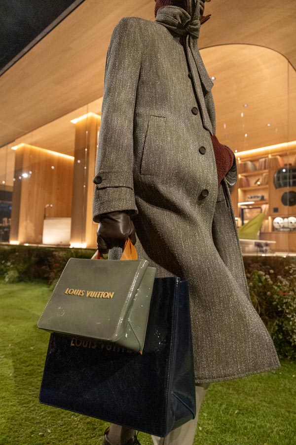 Bags, as expected, were where the fantasy escalated. LV Silk-Nylon, a fabric that convincingly mimics leather while remaining water-repellent and lightweight, was one of the collection’s key innovations. It translated seamlessly across outerwear and accessories, especially in reimagined icons like the Shoulder Alma and Christopher backpack. Meanwhile, the Speedy P9 continued its evolution with a glow-in-the-dark Monogram, reversible colourways, and perforated leather that reveals depth rather than decoration.
