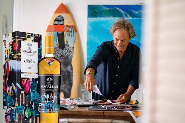 For the look of Concept No 3, Carson visited The Macallan's Speyside estate, where he spent time with Polly Logan, a whisky maker for The Macallan. The result is a handmade collage that includes hues found on The Macallan Estate (the red represents the sherry-seasoned oak casks; the blue represents the River Spey). For the bottle's content, Logan drew influence from Carson's character and career to craft a whisky with a distinctive golden hue that signals Carson's years on the West Coast.
