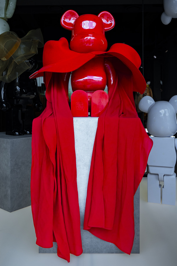 Your journey begins at the entrance with Nobuki Hizume’s impressionable display. Hizume, celebrated for his couture millinery, always had a knack for pushing the boundaries of what a hat can be. Here, he takes his skill and imagination a step further by placing avant-garde headwear on BE@RBRICK figures, transforming them into sculptural beings that demands the attention.