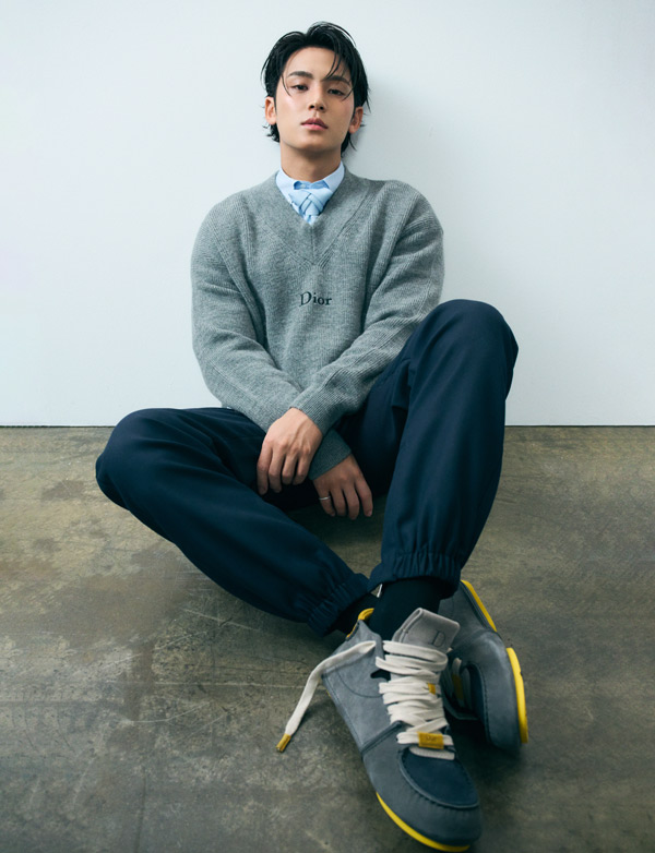 Men’s shirt, sweater, joggers, Eldredge knot tie and Dior Roadie shoes, DIOR.