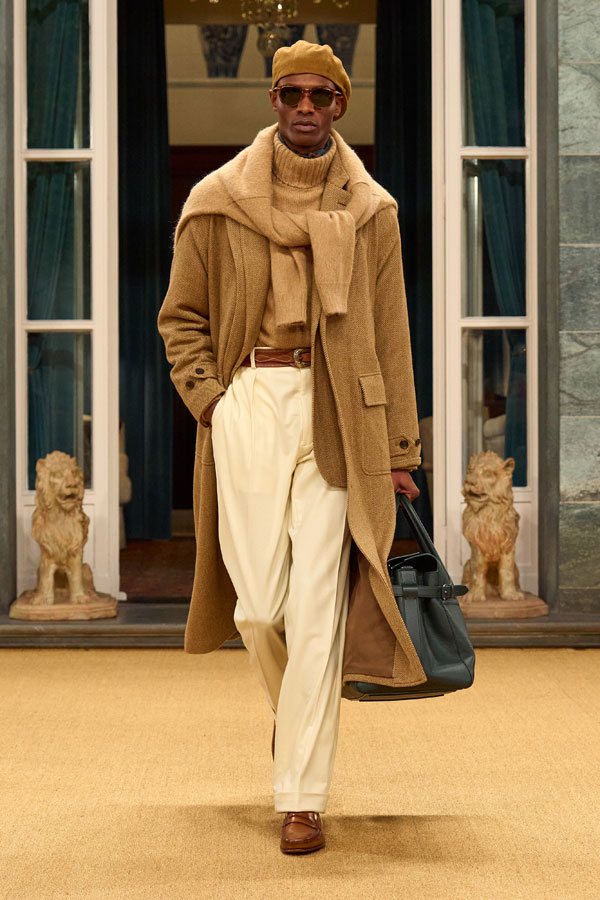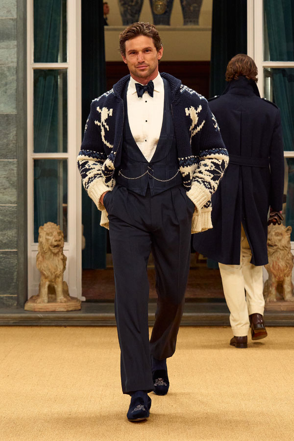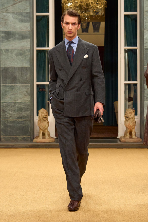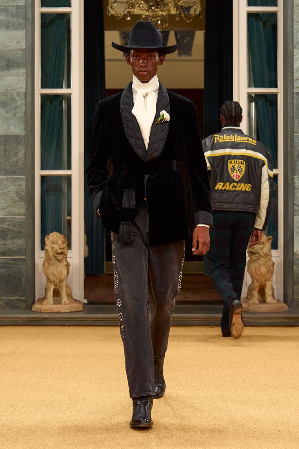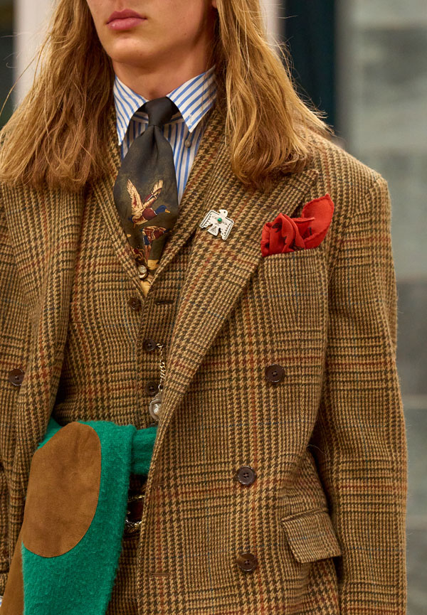 The details: There were plenty to see but the Polo Ralph Lauren evening slippers were standouts that need to be mentioned. They were almost too jarring but somehow felt completely right with the more stately evening proposals. And the fact that they were worn with coloured socks too such that a bit of that hue peeked out was pretty brilliant. For Purple Label, the belt buckles handmade by Neil Zarama of the Chiricahua Apache Nation—a continued partnership—added gravitas.