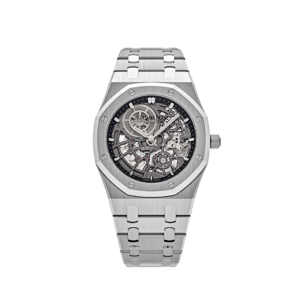The Royal Oak, but turned inside out. In white gold and fully openworked, this is Gérald Genta’s most famous design stripped back to its mechanical bones – high-level stuff.