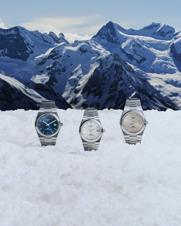 From left: Tissot PRX Titanium 38mm watch in titanium, 35mm watch in steel, and 38mm watch in titanium, TISSOT